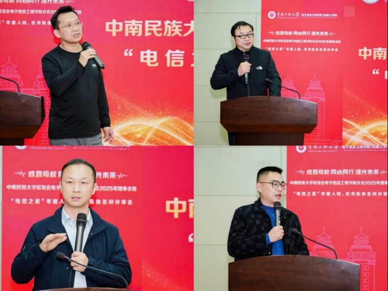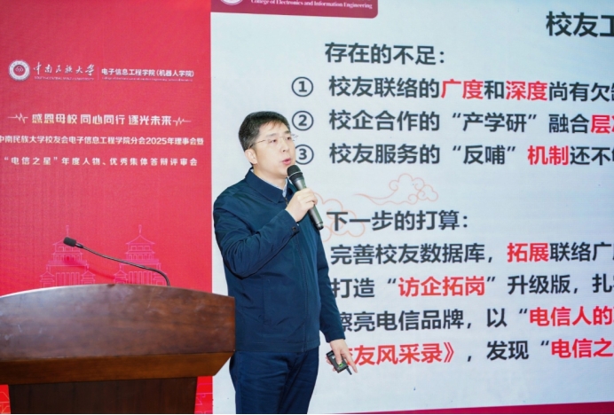 2025年12月27日上午,中南民族大学电子信息工程学院校友分会2025年理事会暨“电信之星”年度人物、优秀集体答辩评审会在16号楼二楼报告厅隆重举行。学校就业与校友工作处副处长朱晶晶、校友分会名誉会长蓝华荣,校友分会副会长、预科教育学院党委书记陈昌华,电信学院领导班子、师生代表及校友理事代表们欢聚一堂,共忆青葱岁月,共话母校发展,共绘学院未来新蓝图。学院党委书记魏大江主持会议。